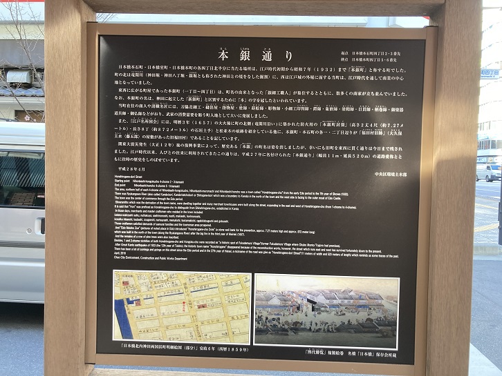 日本橋本石町・日本橋室町・日本橋本町の各四丁目北半分に当たる場所は、江戸時代初期から昭和七年(1932年)まで「本銀町」と称する町でした。町の北は竜閑川(神田堀・神田八丁堀・銀堀とも称された神田との境をなした掘割)に、西は江戸城の外堀に面する当町は、江戸時代を通して商業の中心地となっていました。東西に広がる町屋であった本銀町(一丁目〜四丁目)は、町名の由来となった「銀細工職人」が集住するとともに、数多くの商家が立ち並んでいました。なお、本銀町の名は、神田に起立した「新銀町」と区別するために「本」の字を冠したといわれています。当町在住の商人や諸職名匠には、刀脇差細工・縫箔屋・指物屋・塗師・蒔絵師・彫物師・小細工印判師・鍔師・象嵌師・塗鞘師・目貫師・柄巻師・御楽器道具師・御仏師などがおり、武家の消費需要を賄う町人地として大いに発展しました。また、「江戸名所図会」には、明暦三年(1657年)の大火後に町の北側(竜閑川沿い)に築かれた防火用の「本銀町封彊」(高さ2丈4尺【約7.27メートル】・長さ8丁【約872メートル】の石垣土手)と松並木の痕跡を紹介している他に、本銀町・本石町の各一・二丁目辺りが「福田村旧跡」(大久保主水【藤五郎】の屋敷があった旧福田村)であることを記しています。関東大震災発生(大正十二年)後の復興事業によって、歴史ある「本銀」の町名は姿を消しましたが、幸いにも旧町を東西に貫く通りは今日まで残されました。江戸時代以来、人びとの往来に利用されてきたこの通りは、平成二十七年に名付けられた「本銀通り」(幅員11m・延長520m)の道路愛称とともに往時の歴史をしのばせています。