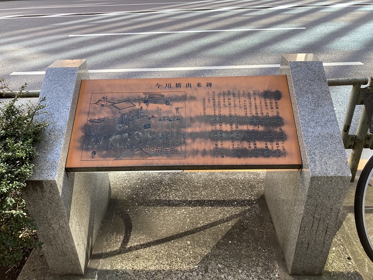 室町四丁目交差点の次が今川橋交差点です。今川焼き発祥のお店がある交差点ではありません。かって、ここには龍閑川流れていました。当時の名主今川氏の尽力で架けられた橋にその功績を因んで今川橋という名が付けられ、それが現在の交差点の名前になりました。歩道の脇に今川橋の由来を記したプレートが置かれています。