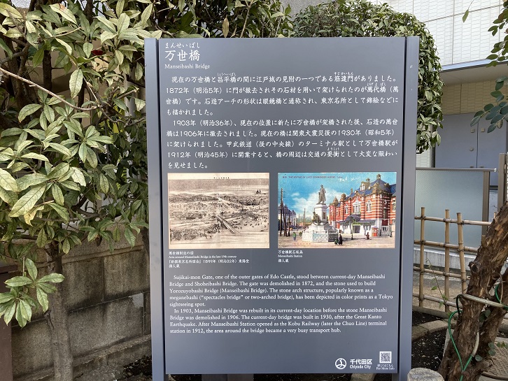 Sujikai-mon Gate, one of the outer gates of Edo Castle, stood between current-day Manseibashi Bridge and Shoheibashi Bridge. The gate was demolished in 1872, and the stone used to build Yorozuyobashi Bridge (Manseibashi Bridge). The stone arch structure, popularly known as a meganebashi ("spectacles bridge" or two-arched bridge), has been depicted in color prints as a Tokyo sightseeing spot. In 1903, Manseibashi Bridge was rebuilt in its current-day location before the stone Manseibashi Bridge was demolished in 1906. The current-day bridge was built in 1930, after the Great Kanto Earthquake. After Manseibashi Station opened as the Kobu Railway (later the Chuo Line) terminal station in 1912, the area around the bridge became a very busy transport hub.