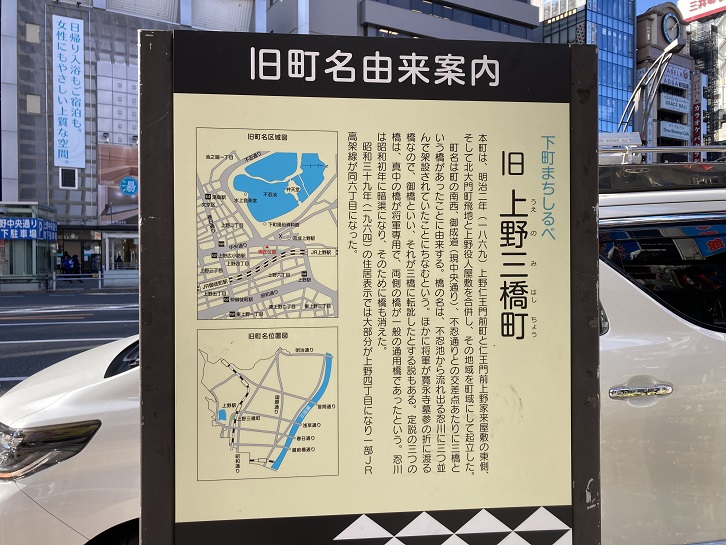 上野にやってきました。アメ横近くの中央通りにも台東区の旧町名案内板が立っています。