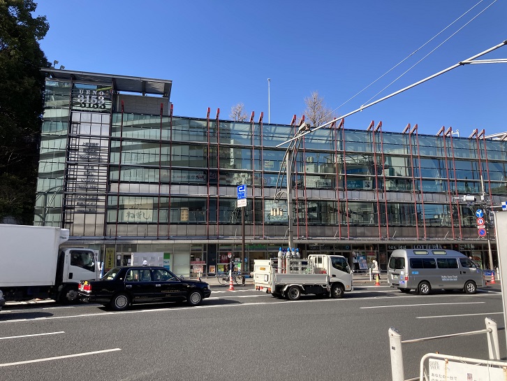 ガード手前、上野公園のシンボルである西郷さん銅像直下には「UENO3153(さいごうさん)」のガラス張りの主にレストランが入っている商業ビルがあります。ここには2008年までファミリーレストラン「聚楽台」が営業していた「上野公園西郷会館」がありました。建物の全面に「聚楽台」と書かれた看板が付けられていましたね。