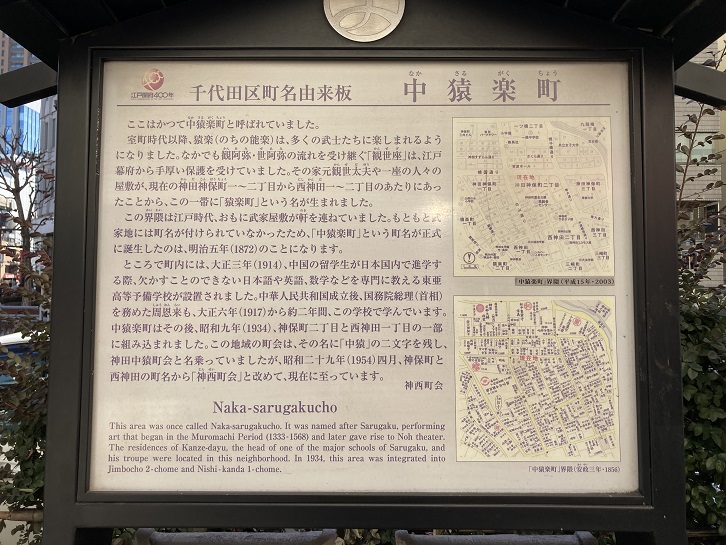 This area was once called Naka-sarugakucho. It was named after Sarugaku, performing art that began in the Muromachi Period (1333-1568) and later gave rise to Noh theater. The residences of Kanze-dayu, the head of one of the major schools of Sarugaku, and his troupe were located in this neighborhood. In 1934, this area was integrated into Jimbocho 2-chome and Nishi - kanda 1-chome.