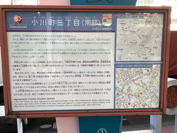 江戸時代、小川町は神田の西半分を占める広大な地域をさす俗称でした。古くは、鷹狩に使う鷹の飼育を行う鷹匠が住んでいたことから、元鷹匠町と呼ばれていましたが、元禄六年(1693年)に小川町と改称されました。五代将軍綱吉が「生類憐みの令」を施行、鷹狩を禁止したため改称されたという話も伝わっています。小川町の名前の由来は、このあたりに清らかな小川が流れていたからとも、「小川の清水」と呼ばれる池があったからともいわれています。江戸城を築いた室町時代の武将太田道灌はその風景を「むさし野の小川の清水たえずして岸の根芹をあらひこそすれ」と詠んでいます。安政三年(1856年)には、この絵図にも見られるとおり、下野足利藩戸田家・越後高田藩榊原家・信濃高遠藩内藤家の上屋敷がありました。小川町の由来ともなった「小川の清水」は、内藤家の屋敷内にあったといわれています。明治五年(1872年)、この一帯は周囲の武家地を整理して表神保町となり、明治十一年(1878年)、神田区に所属します。町内には、勧工場(百貨店の前身)で時計塔としても知られた南明館、大弓場や寄席などがあり、東京を代表する繁華街でした。昭和八年(1933年)の区画整理により、ここは小川町三丁目となります。昭和二十二年(1947年)に神田区と麹町区が合併して千代田区が成立すると、町名も神田小川町三丁目になりました。この界隈は明治のころより学生街として賑わっていましたが、昭和三十年代からは大型のスポーツ用品店が出店しはじめ、現在では東京のみならず日本屈指のスポーツ店街として多くの人々を集めています。
