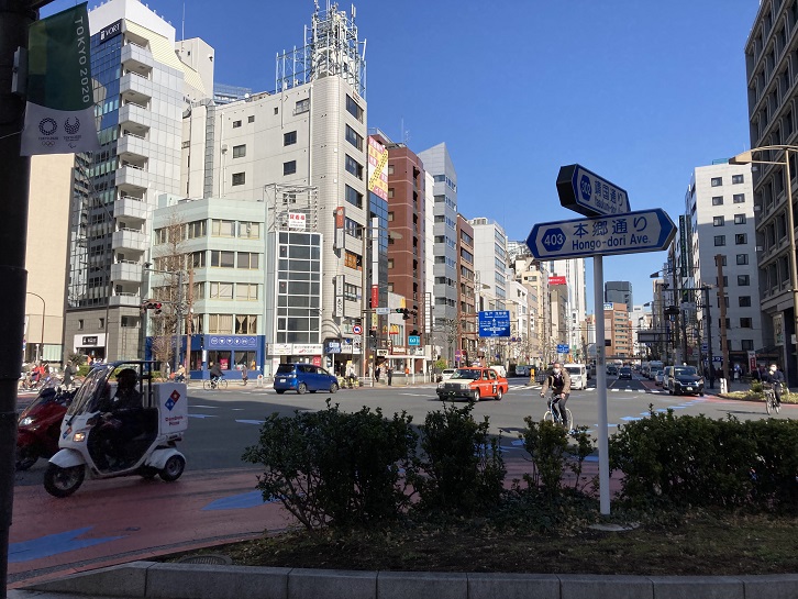 靖国通りに沿って、町会が設置した地元町名の案内板が立っています。