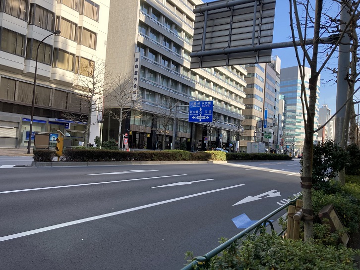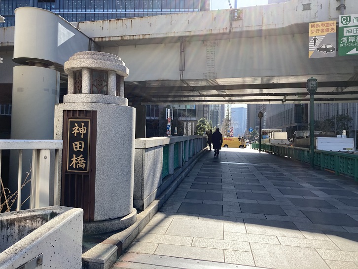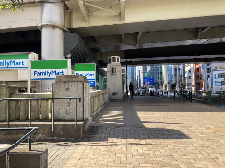 昭和通りと交差した先の首都高上に千代田橋が架かっています。現在は川底部分が首都高の路面になっていますが、かつて流れていた楓川に架かっていた千代田橋です。最初の架橋は昭和三年(1928年)で、首都高速道路の建設で楓川は埋め立てられてしまいましたが、千代田橋は撤去されずにそのまま残っています。都電15系統もこの橋を渡っていたのでしょう。