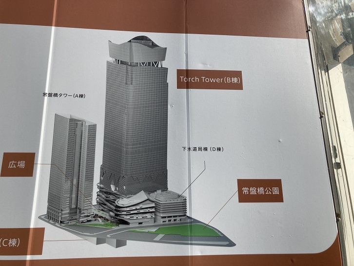 「TOKYO TORCHタワー」は、トーチ風(たいまつ型)のデザインが特徴です。現在日本一の高さを誇るあべのハルカス(地上60階・高さ30m)や2023年3月竣工予定の虎ノ門・麻布台地区第一種市街地再開発事業メインタワー(地上64階・高さ325m)を上回り、日本一の超高層ビルになります。オフィスを主体とし、62階と屋上に屋外空間併設の展望施設、57〜61階に国際級ホテル(約100室)・3〜6階に大規模ホール(約2千席)、地下1階〜6階に商業ゾーンが整備される予定です。