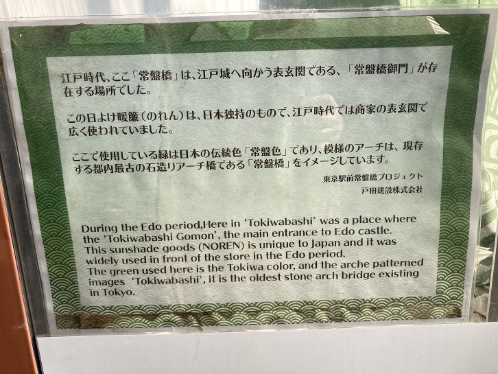 江戸時代、ここ「常盤橋」は、江戸城へ向かう表玄関である、「常盤橋御門」が存在する場所でした。この日よけ暖簾(のれん)は、日本独持のもので、江戸時代では商家の表玄関で広く使われていました。ここで使用している緑は日本の伝統色「常盤色」であり、模様のアーチは、現存する都内最古の石造りアーチ橋である「常盤橋」をイメージしています。