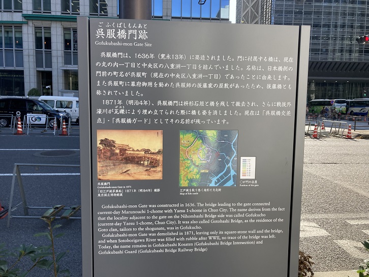 Gofukubashi-mon Gate was constructed in 1636. The bridge leading to the gate connected current-day Marunouchi 1-chome with Yaesu 1-chome in Chuo City. The name derives from the fact that the locality adjacent to the gate on the Nihombashi Bridge side was called Gofukucho (current-day Yaesu 1-chome, Chuo City). It was also called Gotobashi Bridge, as the residence of the Goto clan, tailors to the shogunate, was in Gofukucho. Gofukubashi-mon Gate was demolished in 1871, leaving only its square-stone wall and the bridge, and when Sotoborigawa River was filled with rubble after WWII, no trace of the bridge was left. Today, the name remains in Gofukubashi Kosaten (Gofukubashi Bridge Intersection) and Gofukubashi Guard (Gofukubashi Bridge Railway Bridge).