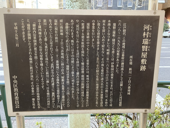 江戸時代、この地域には幕府の御用商人として活躍していた河村瑞賢(1618年〜1699年)の屋敷がありました。瑞賢(瑞軒・随見とも書く)は、伊勢国の農家に生まれ、江戸に出て材木商人となりました。明暦三年(1657年)の江戸大火の際には、木曽の材木を買い占めて財をなし、その後も幕府や諸大名の土木建築を請負い莫大な資産を築きました。また、その財力を基に海運や治水など多くの事業を行いました。瑞賢の業績の中でもとくに重要なのは、奥州や出羽の幕領米を江戸へ廻漕する廻米航路を開拓して輸送経費・期間の削減に成功したことや、淀川をはじめとする諸川を修治して畿内の治水に尽力したことがあげられます。晩年にはその功績により旗本に列せられました。斎藤月岑の「武江年表」によると、瑞賢は貞享年間(1684年〜1688年)頃に南新堀一丁目(当該地域)に移り住み、屋敷は瓦葺の土蔵造りで、塩町(現在の新川一丁目二十三番地域)に入る南角から霊岸島半丁一円を占めていたと記されています。表門は今の永代通りに、裏門はかつて新川一丁目七番・九番付近を流れていた新川に面し、日本橋川の河岸には土蔵四棟があり、広壮な屋敷を構えていたようです。「御府内沿革図書」延宝年間(1673年〜1681年)の霊岸島地図を見ると、瑞賢が開削したとされる堀割に新川が流れ、その事業の一端を知ることができます。