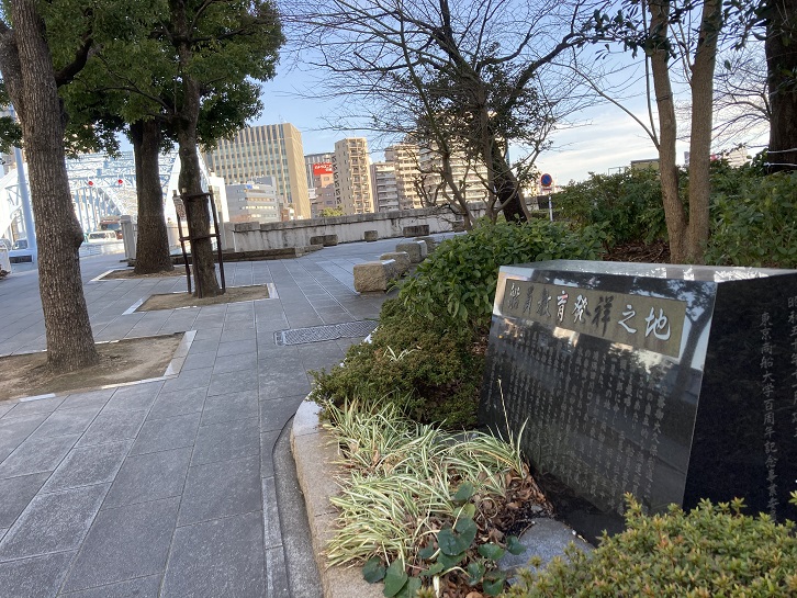 永代橋の手前に「船員教育発祥之地」の石碑が置かれています。