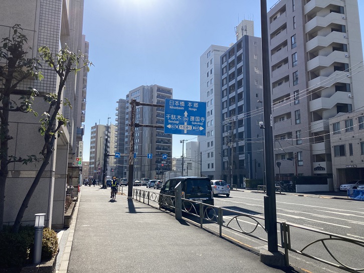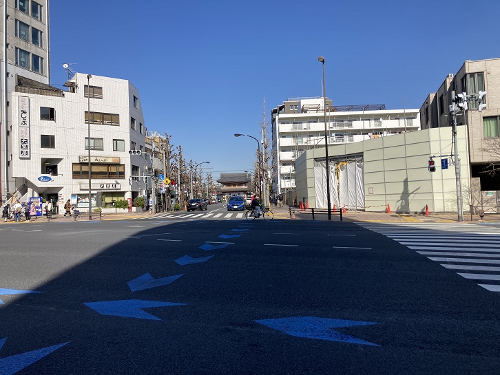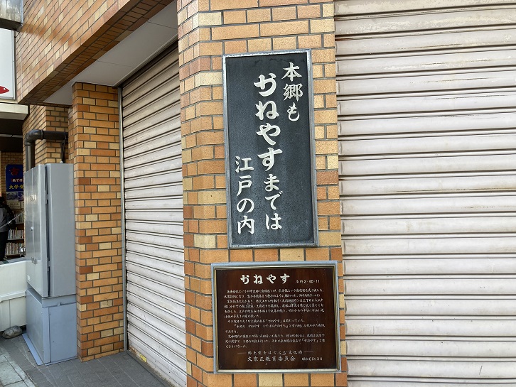 本郷3丁目交差点で本郷通りと交差します。本郷通りには、王子駅と通3丁目を結んでいた都電19系統が走っていました。交差点の南西角に「かねやす」と大書きされたシャッターが見えます。近年まで雑貨屋として営業していたそうですが、数年前に店を畳んだようで今はシャッターを下ろしたままになっています。