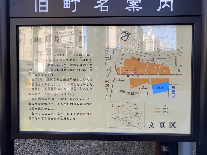 春日通りを進み、大塚3丁目交差点で不忍通りと交差します。ここで池袋駅を起点とする都電17系統と合流し、春日町まで併走していました。歩道の脇に旧町名の案内板が立っています。