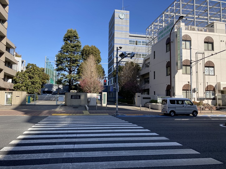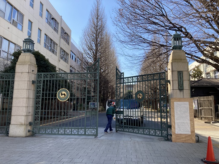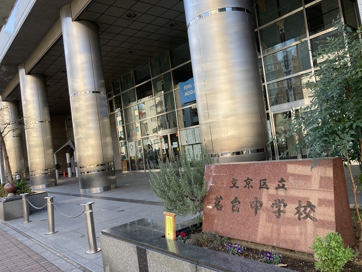 小石川4丁目交差点の角に堂々とした円柱(ピロティといわれる建築様式らしい)の並んだ建物があります。公立の中学校では考えられないような立派な造りです。それなりに歴史のある学校なんですね。