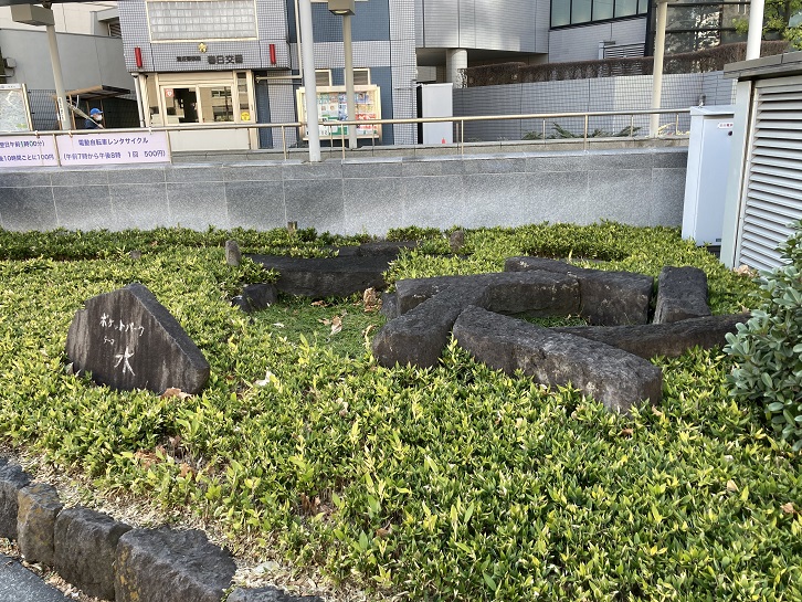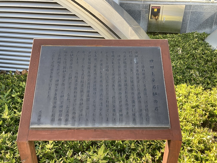 ここに使われている石は、江戸時代に神田上水で使われていた石樋の一部で、昭和六十二年、外堀通りの工事中に現在の水道橋付近から発掘されたものです。神田上水とは近世都市の江戸で最初に整備された上水道であり、コ川家康が江戸入りと同時に造らせたと言われています。水源となる井の頭池の湧水を、大洗堰(現在の文京区関口)を経てから水戸屋敷(現在の小石川後楽園一帯)に入れ、そこから先は暗渠(地下の樋)で通しています。この暗渠で使われていたのが、石樋(石で作った樋)です。なお、お茶の水坂からは、掛樋(木で作った樋)で神田川の上を横断させて、神田・目本橋方面に飲料水として給水されていました。