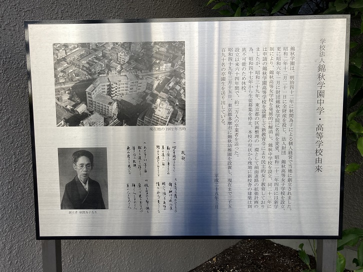 錦秋学園は、明治四十二年に秋間為子による個人経営で当地に創立されました。昭和二年十二月二十一日に全財産を投じ、法人財団錦秋高等女子学校を設立、更に昭和六年一月に財団錦秋女学院に名前を変更、昭和二十二年四月には新学制により、錦秋高等女学校を発展的に解消し、錦秋中学校を設立、同二十三年には申請の錦秋学園高等学校を設置して新教育令により民主的女子教育しておりましたが、昭和三十九年、東京都の区画整理の一環として前面道路の拡張計画の為、昭和四十七年から生徒募集を停止、本校の現状から残地に新校舎の建築は到底不可能のため休校。設立以来六十四年間で、約二万人の卒業者を送った。昭和四十九年三月十五日、東京都多摩市に錦秋幼稚園を設置し、現在まで三千五百九十名の卒園生を送り出している。
