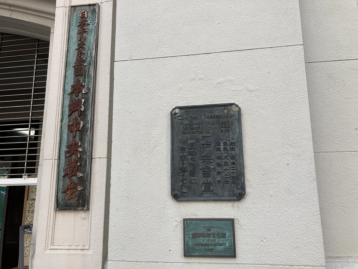 本郷3丁目交差点の先に古めかしい重厚な建物の教会が建っています。「日本キリスト教団本郷中央協会」の中央會堂で、明治二十三年創立・大正十二年震災・昭和四年復興と書いてあります。登録有形文化財に指定されているようです。「真理は汝等に 自由を得さすべし」とありますねぇ。「汝等」は「うぬら」とも読みますが、ここでは「なんじら」と読むのが普通でしょう。