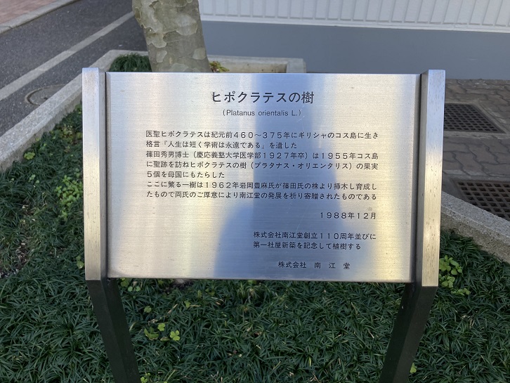 医聖ヒポクラテスは紀元前460年〜375年にギリシャのコス島に生き、格言「人生は短く学術は永遠である」を遺した。篠田秀男博士(慶応義塾大学医学部1927年卒)は1955年コス島に聖跡を訪ねヒポクラテスの樹(プラタナス・オリエンタリス)の果実5個を母国にもたらした。ここに繁る一樹は1962年岩岡豊麻氏が篠田氏の株より挿木し育成したもので両氏のご厚意により南江堂の発展を祈り寄贈されたものである。