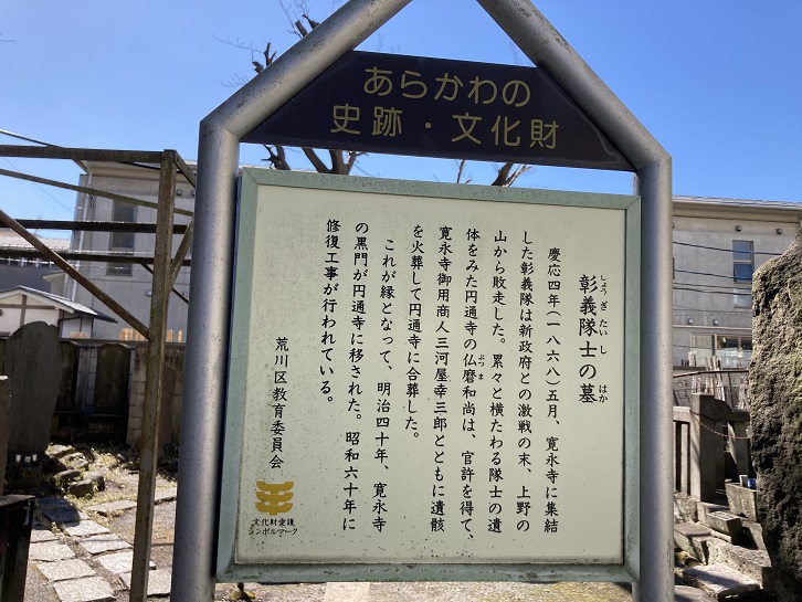 慶応四年(1868年)五月、寛永寺に集結した彰義隊は新政府との激戦の末、上野の山から敗走した。累々と横たわる隊士の遺体をみた円通寺の仏磨和尚は、官許を得て、ェ永寺御用商人三河屋幸三郎とともに遺骸を火葬して円通寺に合葬した。これが縁となって、明治四十年、寛永寺の黒門が円通寺に移された。昭和六十年に修復工事が行われている。