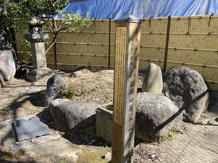 境内には鎌倉時代の板碑が残っています。板碑(いたび)とは、主に供養塔として使われる石碑の一種で、板石卒塔婆とか板石塔婆と呼ばれ、特に典型的なものとして知られる武蔵型板碑は秩父産の緑泥片岩を加工して造られるため、青石塔婆とも呼ばれています。戦国期以降には急激に廃れ、既存の板碑も廃棄されたり用水路の蓋などに転用されたりしました。現在でも残っているのは貴重といえます。