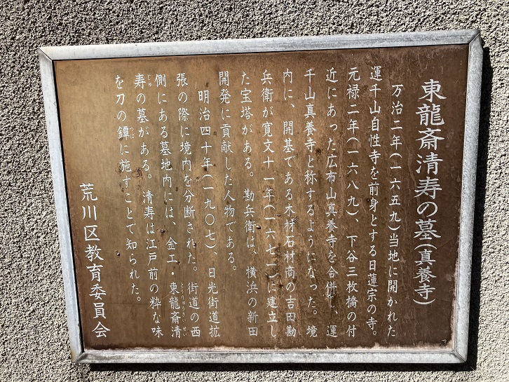 It is said that this temple was founded in 791 by Sakanoue no Tamuramaro, a military commander of the Heian period. Also, when Minamoto no Yoshiie, another military commander during the Heian period, conquered Oshu (present-day Fukushima, Miyagi, Iwate, Aomori, and part of Akita Prefecture), he built a mound on the temple grounds by burying the heads of the 48 adversaries he had defeated. Therefore, this area is called Kozukappara (literally "small mound field"). The temple was popularly known as "Hyakkan'non (100 kan'non/Avalokiteshwara)" because it had Kannon-do (hall) that housed 100 Kan'non statues from hallowed grounds in Chichibu, Bando and Saigoku. However, the Kan'non-do collapsed in the earthquake in 1855. On the temple grounds, there are a seven-storied stone pagoda, graves of Shogitai worriers and four stone stupas (Itabi) inscribed with the year 1296 (designated cultural property of Arakawa City).
