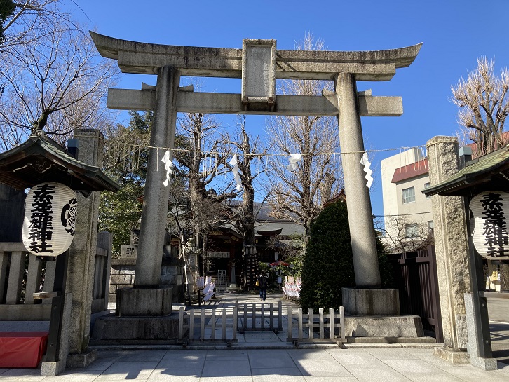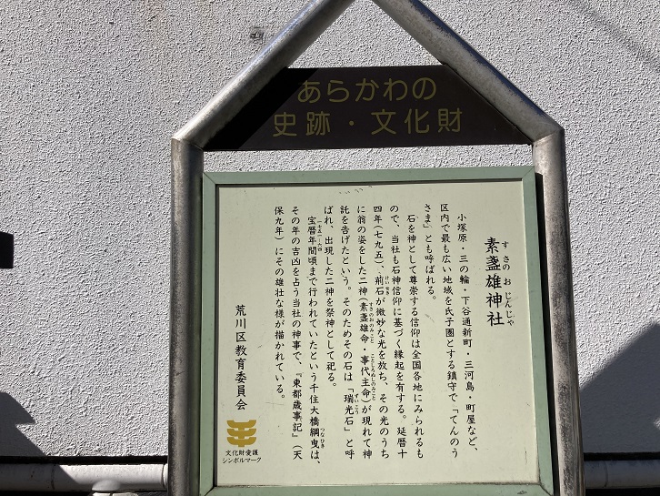 This is a guardian shrine with the largest area of Ujiko (parishioners) in Arakawa City, including not only nearby areas but also Arakawa and Machiya Towns. It is commonly referred to as "Tennosama". According to the history of the shrine, in 795, a hallowed stone suddenly gave off a beautiful light that indicated a good sign, and two deities in the form of old men (Susano'o-Okami and Asuka-Okami) appeared in the light pronouncing divine. messages. People began worshipping the two deities. The stone that gave off that auspicious light is called "Zuiko Seki". In June every year, the Ten'no-sai Festival is held in which a huge Mikoshi (portable shrine) is swayed from side to side. Until the middle of the 18th century, a quaint tug-of-war ritual was held on the Senju-ohashi Bridge to divine harvest.
