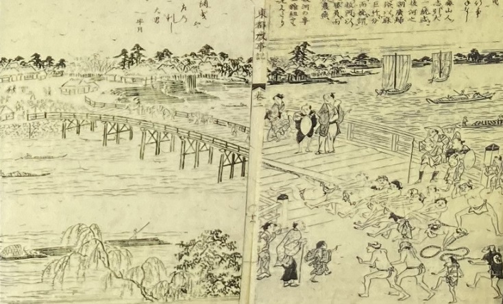 案内板に添えられた図によりますと、川幅と橋の長さが相当なものであったことが分かります。隅田川には護岸もなく、自然な流れが見えます。現在の風景とは全く違いますね。