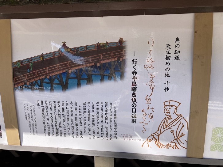 千住大橋を渡ったところに小さな公園があります。奥の細道に関する様々な案内板が立っています。矢立の句も更に詳しく解説されています。元禄二年3月27日(1689年5月16日)、松尾芭蕉は門人曾良とともに、千住大橋付近から俳諧紀行「おくのほそ道」の旅へ立ちました。その後、千住地域は芭蕉の俳諧を追慕する地となり、文政三年(1820年)には琳派絵師の酒井抱一が顕彰したのをはじめ、現在までいくつかの芭蕉の記念碑と像が建立されています。