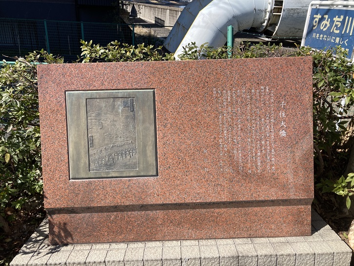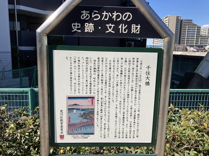 案内板には18世紀の千住大橋の様子が描かれた挿絵が添えられています。小川に架かる小さな橋のように見えますが、実際は当時としては長大な橋だったのでしょう。