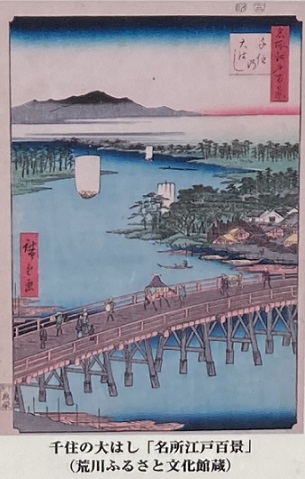 ”千住大橋”は”千住の大橋”とも呼ばれている。最初の橋は、徳川家康が江戸城に入って四年目の文禄三年(1594年)に架けられた。隅田川の橋の中では、一番先に架けられた橋である。当初は、ただ”大橋”と呼ばれていたが、下流に大橋(両国橋)や新大橋がつくられてから”千住”の地名を付して呼ばれるようになった。江戸時代の大橋は木橋で、長さ六十六間(約120メートル)、幅四間(約7メートル)であった。奥州・日光・水戸三街道の要地をしめて、千住の宿を南北に結び、三十余藩の大名行列がゆきかう東北への唯一の大橋であった。松尾芭蕉が奥州への旅で人々と別れたところもここである。現在の鉄橋は関東大震災の復興事業で昭和二年(1927年)に架けられ、近年の交通量の増大のため、昭和四十八年(1973年)新橋がそえられた。