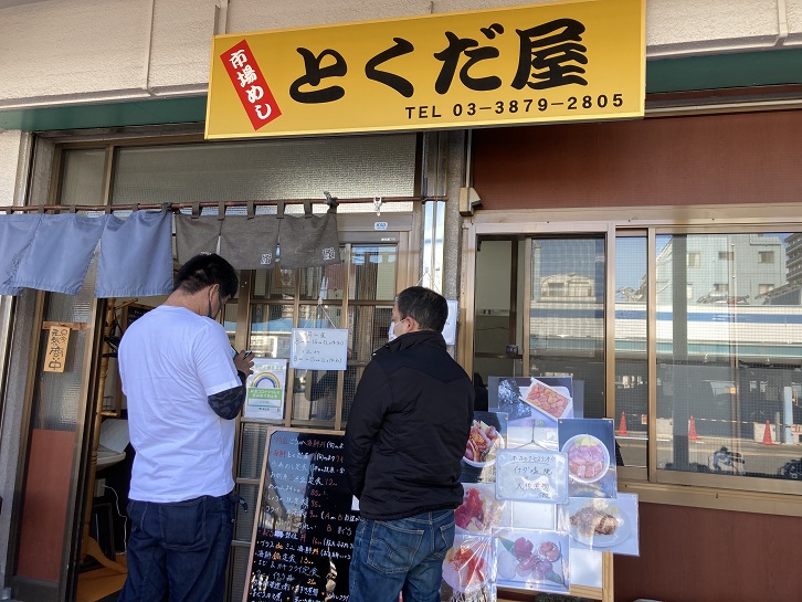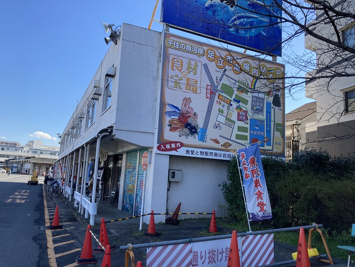 足立市場は天正年間に始まったといわれる歴史ある市場です。当時は川魚・青物・米穀を扱い、江戸三大青物市場のひとつで、幕府の御用市場でもありました。その後、青果部門を分離・移転し、現在は鮮魚を約30%、マグロ類を約8%、冷凍品や塩干加工品を約62%扱っており、小さな単位を卸売する店もあるなど、種類や量が豊富なことが特徴です。市場には新鮮な魚介類を供する食堂が必ず備わっています。市場の従業員とか、買い出しのお客さん相手の魚料理が食べられます。遅い時間だったためか、お客さんは少なめです。