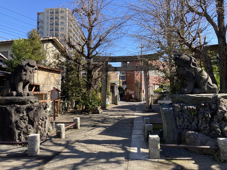 狛犬は高麗犬とも書く。コマというのは異国を意味しているので高麗の字を宛てたようである。狛犬は石などで造り、御殿や神社の前に据え置くもの。鬼魅を避けるためといふ。起源については種々の説があって一定しない。一般に狛犬を唐獅子と言ったりするように、本来は獅子ではないかと思われる節がある。当神社の狛犬は足立区内最大の狛犬で自然石を組み上げた上に鎮座させている阿吽(あうん)の一対。口を開けている方が阿で雄という。口を閉じているのが雌。何でも大きなものが好きな「やっちや場」の旦那衆が造りあげたものである。残念ながら石工は疎か献納者の名も刻んでいない。良く似た兄弟狛犬がある。浅草寺隣り三社祭で知られる浅草神社の狛犬。台座の石組みもそっくり同じ手法でダイナミックなノミ捌きも同じ石工の作としか思えない。皆様も是非浅草神社でご覧下さい。