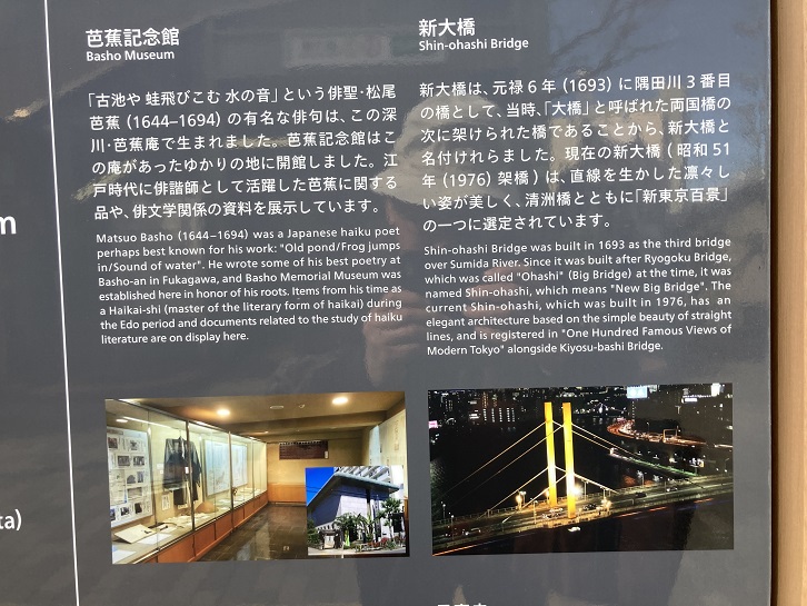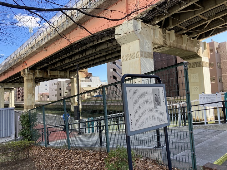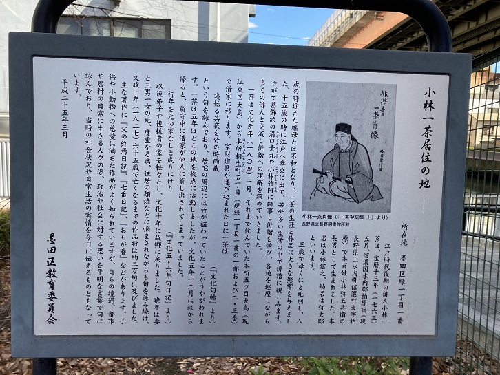 首都高7号線が上空を通る堅川に架かる二之橋北詰の脇に、小林一茶の案内板が立っています。