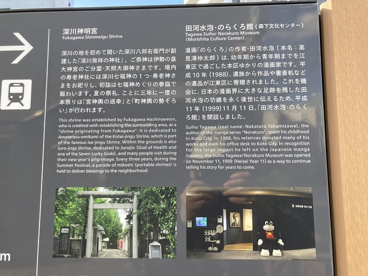 Suiho Tagawa (real name : Nakataro Takamizawa), the author of the manga series "Norakuro", spent his childhood in Koto City. In 1988 (Its correct year is 1998), his relatives donated many of his works and even his office desk to Koto City. In recognition for the large impact he left on the Japanese manga industry, the Suiho Tagawa/Norakuro Museum was opened on November 11, 1999 (Heisei Year 11) as a way to continue telling his story for years to come.