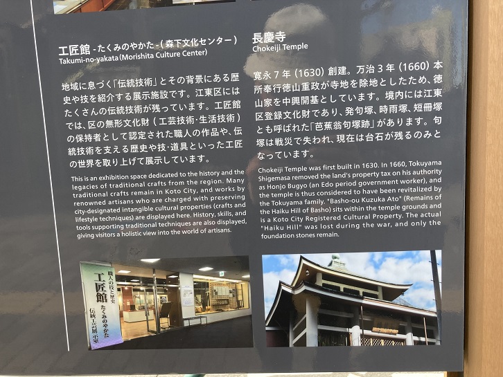 Chokeiji Temple was first built in 1630. In 1660, Tokuyama Shigemasa removed the land's property tax on his authority as Honjo Bugyo (an Edo period government worker), and the temple is thus considered to have been revitalized by the Tokuyama family. "Basho-ou Kuzuka Ato" (Remains of the Haiku Hill of Basho) sits within the temple grounds and is a Koto City Registered Cultural Property. The actual "Haiku Hill" was lost during the war, and only the foundation stones remain.