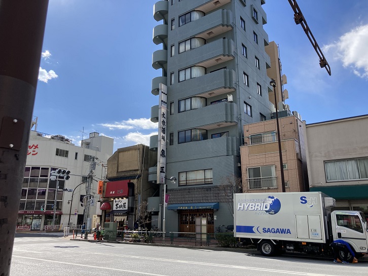 森下駅前交差点先の右手に細長い鉛筆型のマンションが建っていて、その1階に魚三酒場常盤店(森下店とも呼ばれます)があります。魚三酒場というと、門前仲町の富岡店が有名ですが、実はここ常盤店と新小岩店も同じ魚三酒場なのです。まだお昼時でお店は開いていませんが、コロナ渦でも開店前には行列ができそうです。