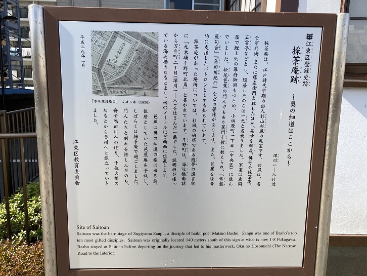 Saitoan was the hermitage of Sugiyama Sanpu, a disciple of haiku poet Matsuo Basho. Sanpu was one of Basho's top ten most gifted disciples. Saitoan was originally located 140 meters south of this sign at what is now 1-8 Fukagawa. Basho stayed at Saitoan before departing on the journey that led to his masterwork, Oku no Hosomichi (The Narrow Road to the Interior).