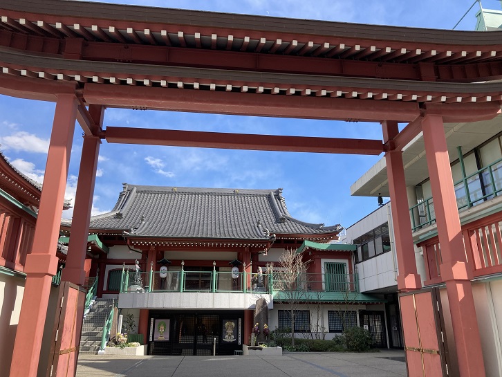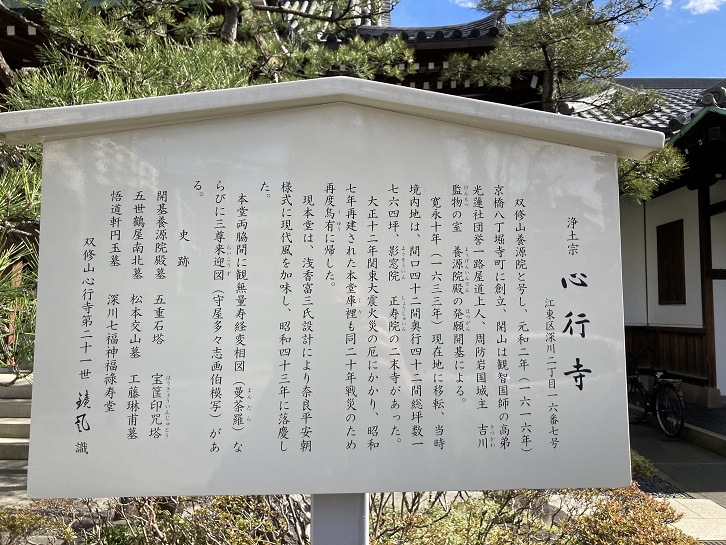 葛西橋通りと交差する深川一丁目交差点の手前に3つのお寺が並んで建っています。一番手前の心行寺は雙修山養源院と号し、元和二年(1616年)に八丁堀に創建され、寛永十年(1633年)に現在地に移りました。寺名の養源院は、延宝元年(1673年)に錦帯橋を架橋した第二代岩国藩主吉川広嘉(1621年〜1680年)の正室です。心行寺は、深川七福神(福禄寿)のひとつとして親しまれています。