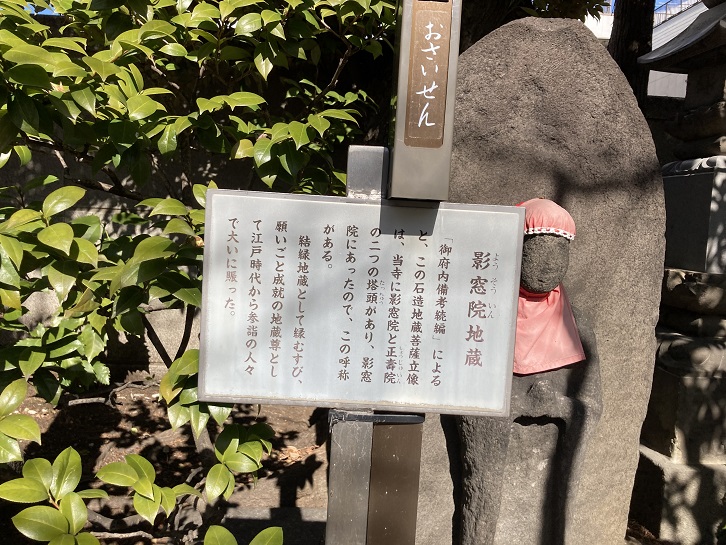「御府内備考続編」によると、この石造地蔵菩薩立像は、当寺に影窓院と正壽院の二つの塔頭があり、影窓院にあったので、この呼称がある。結縁地蔵として緑むすび、願いごと成就の地蔵尊として江戸時代から参詣の人々で大いに賑った。