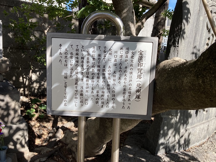宝筺印咒塔(ほうきょういんじゅとう)は、文化文政年間に江戸の名妓といわれた川口直が夫・忠七の菩提を弔うために建立したものです。