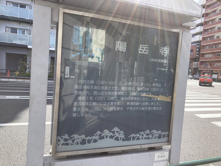 向井忠勝(1582年〜1641年)は、60歳で没しました。戒名は、陽岳寺殿天海玄祐居士です。陽岳寺は、寛永十四年(1637年)に創建され、開山は文室祖郁禅師で、開基は忠勝です。慶長二年(1597年)16歳で、後の将軍秀忠に仕え、大坂冬・夏の両度の戦いには水軍を率い、摂津尼崎へ出陣しました。寛永二年(1625年)父の跡を継ぎ、子孫は代々船手頭の職を世襲しました。