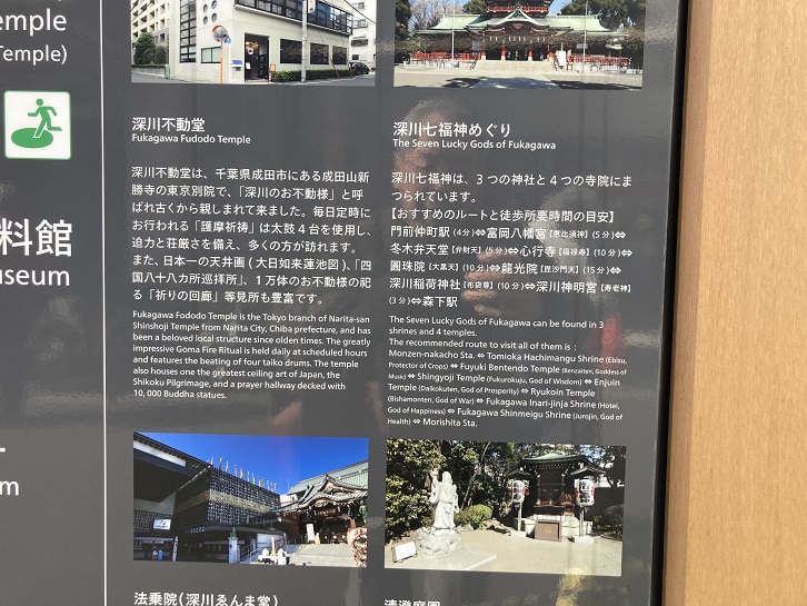 The Seven Lucky Gods of Fukagawa can be found in 3 shrines and 4 temples. The recommended route to visit all of them is :