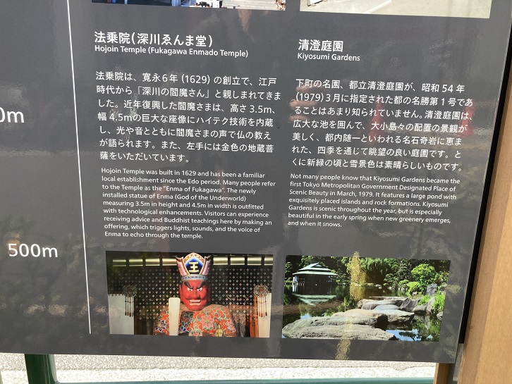 Hojoin Temple was built in 1629 and has been a familiar local establishment since the Edo period. Many people refer to the Temple as the "Enma of Fukagawa". The newly installed statue of Enma (God of the Underworld) measuring 3.5m in height and 4.5m in width is outfitted with technological enhancements. Visitors can experience receiving advice and Buddhist teachings here by making an offering, which triggers lights, sounds, and the voice of Enma to echo through the temple.