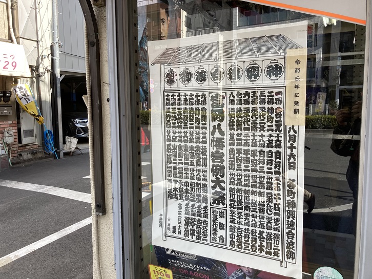 とあるお店の窓ガラスに「富岡八幡宮例大祭」のポスターが貼ってあります。恐らくは去年(令和二年)用のものだと思いますが、「令和三年に延期」という文字が空しく思えます。まさか、令和三年も中止になるとは思ってもみなかったことでしょう。都電23系統跡を歩いていた時点では一縷の望みもあったと思うのですが、現実には今年の八月はコロナの感染爆発でお祭りどころではありませんでしたからね。