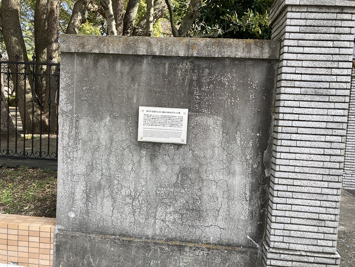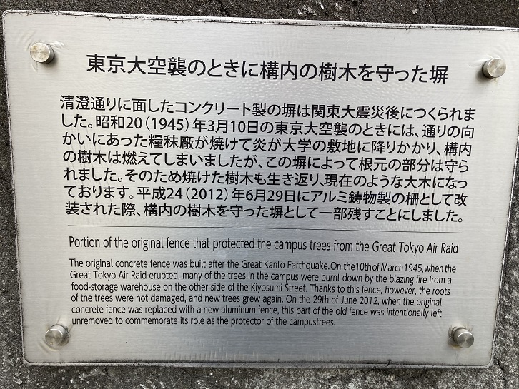 The original concrete fence was built after the Great Kanto Earthquake. On the 10th of March 1945, when the Great Tokyo Air Raid erupted, many of the trees in the campus were burnt down by the blazing fire from a food-storage warehouse on the other side of the Kiyosumi Street. Thanks to this fence, however, the roots of the trees were not damaged, and new trees grew again. On the 29th of June 2012, when the original concrete fence was replaced with a new aluminum fence, this part of the old fence was intentionally left unremoved to commemorate its role as the protector of the campustrees.