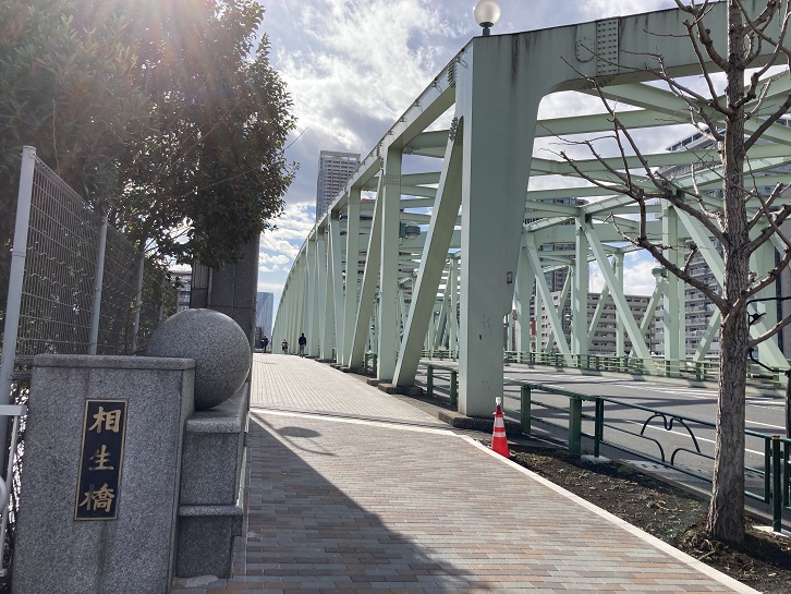 佃島が埋立てられて月島となって人々が住む町が開けるとともに、交通の便や水道が必要になった。そこでまず深川との間にこの相生橋が架けられた。明治三十六年(1903年)のことであった。その後改修され、中の島で大橋と小橋とに分かれるようになった。隅田川がここで左右に大きく分岐するところの左側にあたっていて、川が湾曲するするため、上流から流れてきたものが滞留したところである。関東大震災の時も、今次の大戦の空襲のあとにも、さまざまなものが山のように集まった。ことに震災の時までは木橋であったため、橋も延焼した。現在の橋は、大正十五年(1926年)11月に、 震災復興事業の最初の架橋として完成した。