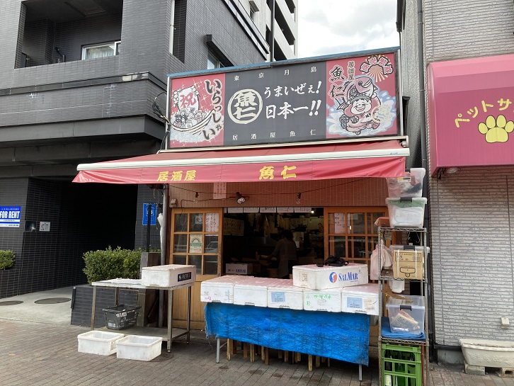 月島にはまだまだ少なからぬ昭和の名残りが残っています。清澄通りに面した小さな店構えですが、魚仁は月島の人気居酒屋です。一見して下町のお魚屋さんのような外観の店内には長机と簡易イスが置いてあり、昭和の雰囲気が満点で、いつも多くのお客さんで賑わっています。メニューは刺身の盛り合わせ・鰤大根・鮪ホッべ刺・マグロの脳天などといった多彩な海鮮ものが揃います。どれも下町価格で、ボリューム満点です。また、もつ煮込みやチャーシューなど、煮つけなども揃っています。魚仁の昼間の外観は活気にあふれた魚屋さんそのものです。「うまいぜぇ!日本一!!」の看板が掲げられた店舗では威勢の良い店員さんが新鮮な魚介類を次々と売りさばいています。夜になり、店頭販売が終わると居酒屋に早変わりし、店舗の外までテーブル席が張り出して、気軽に立ち寄りたくなる大衆居酒屋の趣となります。私も随分前に一度だけお邪魔しましたが、東南アジア系の女性店員の元気溢れる接客が印象に残っています。