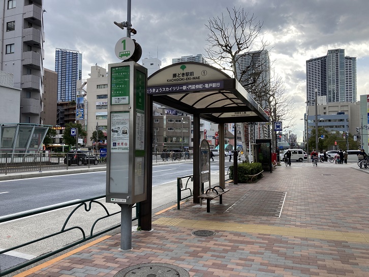 勝どき駅前交差点に着きました。都電23系統の終点の「月島通八丁目電停」は交差点近辺にありました。新宿駅東口からやって来た通常運転の都電11系統の終点にもなっていました(延長運転の時は新佃島が終点で、月島通八丁目電停から新佃島の区間は都電23系統とルートが重なっていました)。「月島通」は、現在の勝どき交差点付近の道路名で、その後清澄通りに吸収されました。ちなみに、「月島」という地名は、築地と同様に海に新たに築かれた島「築島」が由来といわれていますが、江戸時代から江戸湊(現在の東京湾)内にあった月見の名所「月の岬」から名付けられたという説もあります。