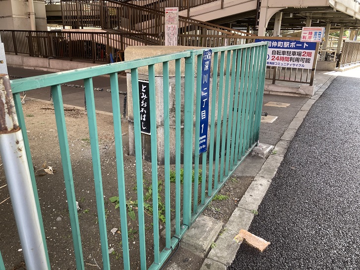 陽岳寺の先の油掘川公園に「とみおかはし」と記されたコンクリート製の橋の親柱の一部が保存されています。かつて永代寺(現・深川不動堂)・富岡八幡宮の北側を流れた十五間川(通称「油堀」)に架かっていた富岡橋の跡です。現在、十五間川は埋め立てられ、首都高速9号深川線が走っています。昨年の晩秋に「東京の河川を歩く」の油堀川編でも通りました。都電も富岡橋を通っていたんですね。