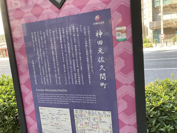ここはかつて神田元佐久間町と呼ばれていました。江戸時代、この界隈には豊前小倉藩小笠原家の中屋敷がありました。明治二年(1869年)十二月に発生した火事で、このあたりは様相を一変します。神田相生町から出た火は、現在の外神田周辺を焼き尽くしたといわれています。明治新政府は、神田佐久間町一丁目内にあった神田柳屋敷などに火除地(防火のための空き地)を設置しました。そのため、そこに住んでいた人々が代地として小笠原家屋敷跡に移転してきたのです。明治三年(1870年)のことでした。神田元佐久間町の町名が生まれたのはこの時です。新たに生まれたこの町を神田佐久間町と区別するため「元」が付けられたのです。明治四十四年(1911年)、いったん元佐久間町と改称されましたが、昭和二十二年(1947年)、千代田区ができたときに町名はふたたび神田元佐久間町となりました。この町名は、一帯が住居表示の実施によって外神田五丁目となる昭和三十九年(1964年)まで使われていました。