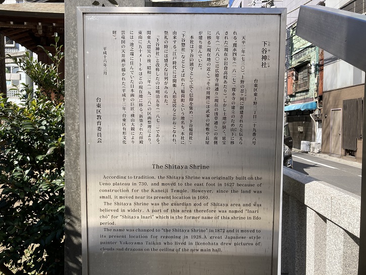 According to tradition, the Shitaya Shrine was originally built on the Ueno plateau in 730, and moved to the east foot in 1627 because of construction for the Kaneiji Temple. However, since the land was small, it moved near its present location in 1680. The Shitaya Shrine was the guardian god of Shitaya area and was believed in widely. A part of this area therefore was named "Inari cho" for "Shitaya Inari" which is the former name of this shrine in Edo period. The name was changed to "the Shitaya Shrine" in 1872 and it moved to its present location for rezoning in 1928. A great Japanese-style painter Yokoyama Taikan who lived in Ikenohata drew pictures of clouds and dragons on the ceiling of the new main hall.